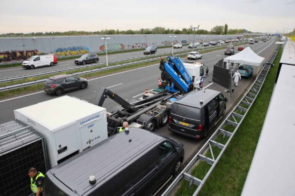 De route leek op een oorlogsgebied, het oranje-zwarte konvooi baande zich slalommend een weg door alle ellende. Zelfs een forensisch onderzoek met veel poeha langs de A4 waar iemand met het afgehakte hoofd van zijn slachtoffer in de auto werd aangehouden.